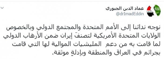 وكتب عبر تغريدة له على "تويتر" رصدها " المشهد العربي": "نوجه ندائنا إلى الأمم المتحدة والمجتمع الدولي وبالخصوص الولايات المتحدة الأمريكية لتصنفَ إيران ضمن الإرهاب الدولي لما قامت به من دعم المليشيات الموالية لها التي قامت بجرائم في العراق والمنطقة وبأدلة موثقة".
