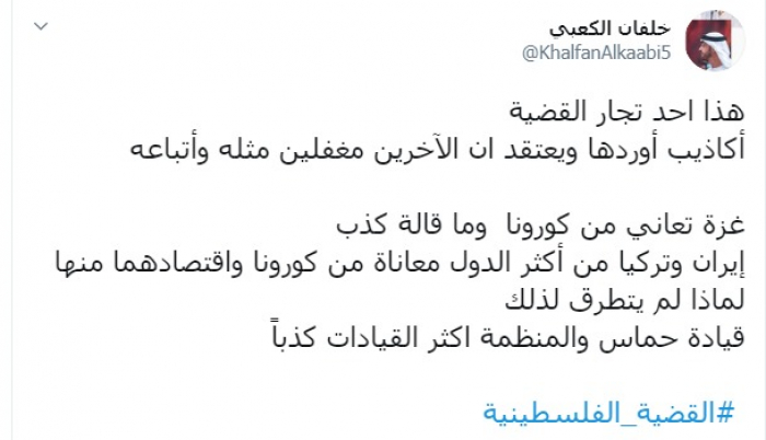 وكتب عبر تغريدة له على "تويتر" رصدها " المشهد العربي": "هذا أحد تجار القضية، أكاذيب أوردها ويعتقد أن الآخرين مغفلين مثله وأتباعه، غزة تعاني من كورونا وما قاله كذب، إيران وتركيا من أكثر الدول معاناة من كورونا واقتصادهما منها لماذا لم يتطرق لذلك، قيادة حماس والمنظمة أكثر القيادات كذبا".