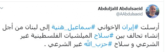 وكتب عبر تغريدة له على "تويتر" رصدها " المشهد العربي": "أرسلت إيران الإخواني إسماعيل هنية إلى لبنان من أجل إنشاء تحالف بين سلاح الميلشيات الفلسطينية غير الشرعي و سلاح حزب الله غير الشرعي" .