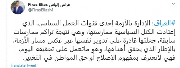 وكتب في تغريدة عبر "تويتر" رصدها "المشهد العربي": "العراق؛ الإدارة بالأزمة إحدى قنوات العمل السياسي، الذي اعتادت الكتل السياسية ممارستها، وهي نتيجة تراكم ممارسات سابقة، جعلتها قادرة على تدوير نفسها عبر عكس مسار الأزمة، بالإطار الذي يحقق أهدافها، وهو ما تعمل على تحقيقه اليوم، فهي لا تعترف بمفهوم الإصلاح أو حق المواطن في التغيير".