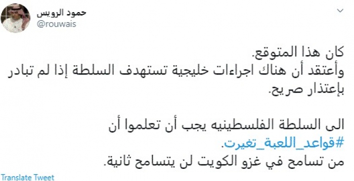 وجه الكاتب والمحلل السياسي السعودي حمود الرويس، اليوم، رسالة نارية للسلطة الفلسطينية، بعد التصريحات الأخيرة بمؤتمر الفصائل الفلسطينية الذي عقد في بيروت مؤخرًا.