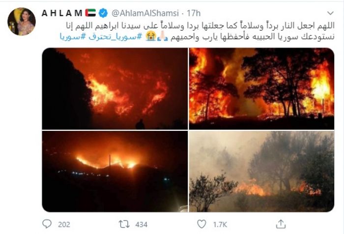دعت النجمة الإماراتية أحلام لسوريا وشعبها بعد الحرائق الأخيرة، وكتبت عبر حسابها الرسمي بموقع تويتر قائلة :" اللهم اجعل النار برداً وسلاماً كما جعلتها بردا وسلاماً على سيدنا ابراهيم اللهم إنا نستودعك سوريا الحبيبه فأحفظها يارب واحميهم".
