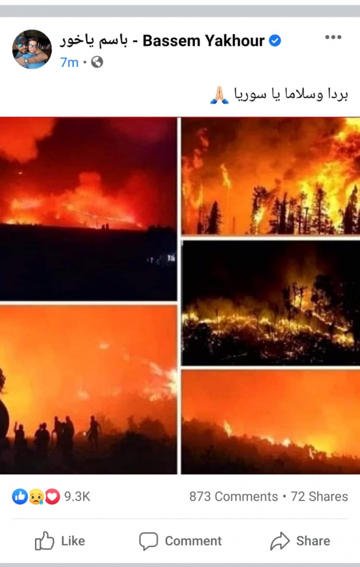 دعا الفنان السوري باسم ياخور لوطنه سوريا وللشعب السوري، بعد الحرائق الأخيرة التي تتعرض لها البلاد، ونشر ياخور صورة من حرائق الغابات بسوريا عبر حسابه الرسمي بموقع "فيس بوك"، وعلق قائلا بردا وسلاما يا سوريا.