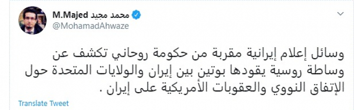 وقال في تغريدة عبر "تويتر" رصدها "المشهد العربي": "وسائل إعلام إيرانية مقربة من حكومة روحاني تكشف عن وساطة روسية يقودها بوتين بين إيران والولايات المتحدة حول الاتفاق النووي والعقوبات الأمريكية على إيران".