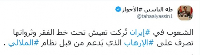 وكتب عبر تغريدة له على "تويتر" رصدها " المشهد العربي": "الشعوب في إيران تُركت تعيش تحت خط الفقر وثرواتها تصرف على الإرهاب الذي يُدعم من قبل نظام الملالي".