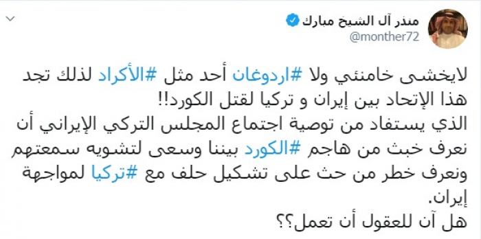 وكتب عبر تغريدة له على "تويتر" رصدها " المشهد العربي": "لا يخشى خامنئي ولا أردوغان أحد مثل الأكراد لذلك تجد هذا الاتحاد بين إيران و تركيا لقتل الكورد، الذي يستفاد من توصية اجتماع المجلس التركي الإيراني أن نعرف خبث من هاجم الكورد بيننا وسعى لتشويه سمعتهم ونعرف خطر من حث على تشكيل حلف مع تركيا لمواجهة إيران، هل آن للعقول أن تعمل".