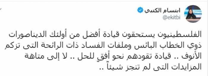 وكتب عبر تغريدة له على "تويتر" رصدها " المشهد العربي": "الفلسطينيون يستحقون قيادة أفضل من أولئك الديناصورات ذوي الخطاب البائس وملفات الفساد ذات الرائحة التي تزكم الأنوف، قيادة تقودهم نحو أفقٍ للحل، لا إلى متاهة المزايدات التي لم تنجز شيئاً".