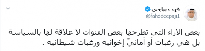 وكتب عبر تغريدة له على "تويتر" رصدها " المشهد العربي": "بعض الآراء التي تطرحها بعض القنوات لا علاقة لها بالسياسة بل هي رغبات أو أمانيّ إخوانية ورغبات شيطانية".