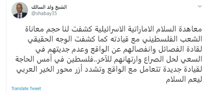 قال الكاتب الصحفي الموريتاني الشيخ ولد السالك، اليوم، إن الاتفاق الإماراتي الإسرائيلي كشف حجم معاناة الشعب الفلسطيني مع قياداته.