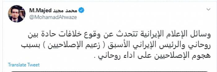 وقال في تغريدة عبر "تويتر" رصدها "المشهد العربي": "وسائل الإعلام الإيرانية تتحدث عن وقوع خلافات حادة بين روحاني والرئيس الإيراني الأسبق (زعيم الإصلاحيين) بسبب هجوم الإصلاحيين على أداء روحاني".