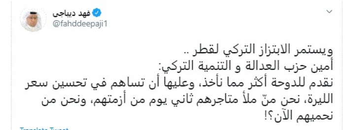 وقال في تغريدة عبر "تويتر" رصدها "المشهد العربي": "ويستمر الابتزاز التركي لقطر.. أمين حزب العدالة و التنمية التركي: نقدم للدوحة أكثر مما نأخذ، وعليها أن تساهم في تحسين سعر الليرة، نحن منّ ملأ متاجرهم ثاني يوم من أزمتهم، ونحن من نحميهم الآن؟".