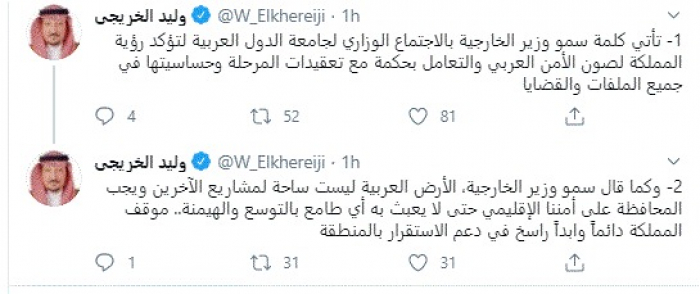 وقال في تغريدة عبر "تويتر" رصدها "المشهد العربي": "تأتي كلمة سمو وزير الخارجية بالاجتماع الوزاري لجامعة الدول العربية لتؤكد رؤية المملكة لصون الأمن العربي والتعامل بحكمة مع تعقيدات المرحلة وحساسيتها في جميع الملفات والقضايا".