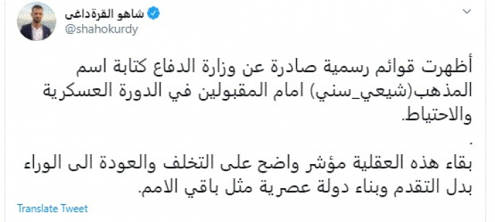 وقال في تغريدة عبر "تويتر" رصدها "المشهد العربي": "أظهرت قوائم رسمية صادرة عن وزارة الدفاع كتابة اسم المذهب (شيعي_سني) أمام المقبولين في الدورة العسكرية والاحتياط".
