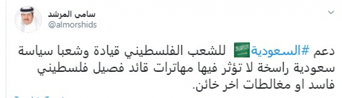وكتب في تغريدة عبر "تويتر" رصدها "المشهد العربي": "دعم السعودية للشعب الفلسطيني قيادة وشعبا سياسة سعودية راسخة لا تؤثر فيها مهاترات قائد فصيل فلسطيني فاسد أو مغالطات آخر خائن".