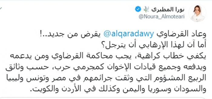 طالبت الكاتبة والباحثة، نورا المطيري، اليوم الأربعاء، بضرورة محاكمة الإرهابي يوسف القرضاوي وقيادات الإخوان لجرائمهم في مصر واليمن وليبيا وسوريا وتونس.