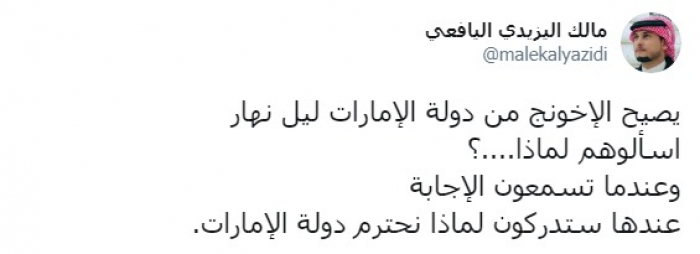 وكتب عبر تغريدة له على "تويتر" رصدها "المشهد العربي": "يصيح الإخونج من دولة الإمارات ليل نهار، اسألوهم لماذا؟ وعندما تسمعون الإجابة، عندها ستدركون لماذا نحترم دولة الإمارات".