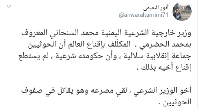 وكتب عبر تغريدة له على "تويتر" رصدها " المشهد العربي": " وزير خارجية الشرعية اليمنية محمد السنحاني المعروف بمحمد الحضرمي ، المكلف بإقناع العالم أن الحوثيين جماعة انقلابية سلالية، وأن حكومته شرعية، لم يستطع إقناع أخيه بذلك، أخو الوزير الشرعي، لقي مصرعه وهو يقاتل في صفوف الحوثيين".
