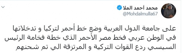 وكتب عبر تغريدة له على "تويتر" رصدها " المشهد العربي": "على جامعة الدول العربية وضع خط أحمر لتركيا و تدخلاتها في الوطن عربي فخط مصر الأحمر الذي خطة فخامة الرئيس السيسي ردع القوات التركية و المرتزقة اللي تم شحنهم".