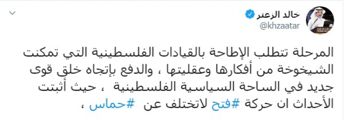 وكتب عبر تغريدة له على "تويتر" رصدها " المشهد العربي": "المرحلة تتطلب الإطاحة بالقيادات الفلسطينية التي تمكنت الشيخوخة من أفكارها وعقليتها، والدفع باتجاه خلق قوى جديدة في الساحة السياسية الفلسطينية ، حيث أثبتت الأحداث أن حركة فتح لا تختلف عن حماس".