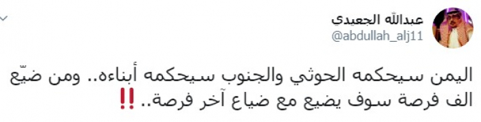 وكتب عبر تغريدة له على "تويتر" رصدها "المشهد العربي": "اليمن سيحكمه الحوثي والجنوب سيحكمه أبناؤه، ومن ضيّع ألف فرصة سوف يضيع مع ضياع آخر فرصة".