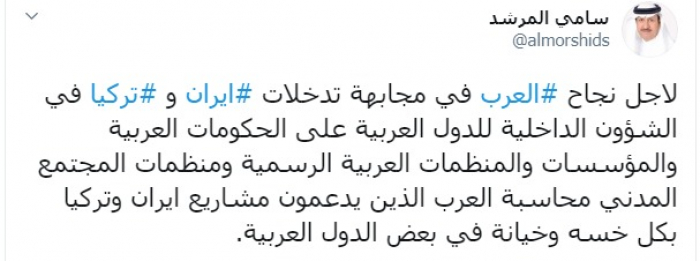 وكتب عبر تغريدة له على "تويتر" رصدها " المشهد العربي": "لأجل نجاح العرب في مجابهة تدخلات إيران و تركيا في الشؤون الداخلية للدول العربية، على الحكومات العربية والمؤسسات والمنظمات العربية الرسمية ومنظمات المجتمع المدني، محاسبة العرب الذين يدعمون مشاريع إيران وتركيا بكل خسه وخيانة في بعض الدول العربية".