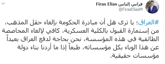 وكتب عبر تغريدة له على "تويتر" رصدها " المشهد العربي": "العراق؛ يا ترى هل أن مبادرة الحكومة بإلغاء حقل المذهب، من استمارة القبول بالكلية العسكرية، كافي لإلغاء المحاصصة الطائفية في هذه المؤسسة، نحن بحاجة لدفع العراق بعيداً عن هذا الوباء بكل مؤسساته، طبعاً إذا ما أردنا بناء دولة مؤسسات حقيقية".