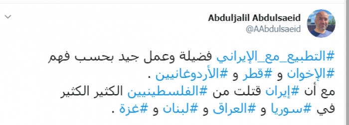 وكتب عبر تغريدة له على "تويتر" رصدها " المشهد العربي": "التطبيع مع الإيراني فضيلة وعمل جيد بحسب فهم الإخوان وقطر و الأردوغانيين، مع أن إيران قتلت من الفلسطينيين الكثير الكثير في سوريا و العراق و لبنان و غزة".
