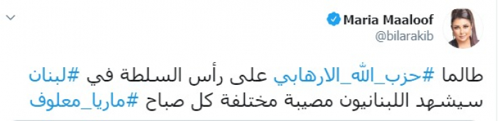 وكتبت عبر تغريدة لها على "تويتر" رصدها " المشهد العربي": "طالما حزب الله الإرهابي على رأس السلطة في لبنان سيشهد اللبنانيون مصيبة مختلفة كل صباح".
