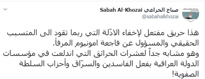 وكتب عبر تغريدة له على "تويتر" رصدها " المشهد العربي": "هذا حريق مفتعل لإخفاء الادّلة التي ربما تقود الى المتسبب الحقيقي والمسؤول عن فاجعة امونيوم المرفأ، وهو مشابه جداً لعشرات الحرائق التي اندلعت في مؤسسات الدولة العراقية بفعل الفاسدين والسرّاق وأحزاب السلطة الصفوية".