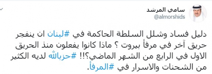 وكتب عبر تغريدة له على "تويتر" رصدها " المشهد العربي": "دليل فساد وشلل السلطة الحاكمة في لبنان أن ينفجر حريق آخر في مرفأ بيروت، ماذا كانوا يفعلون منذ الحريق الأول في الرابع من الشهر الماضي، حزب الله لديه الكثير من الشحنات والأسرار في المرفأ".