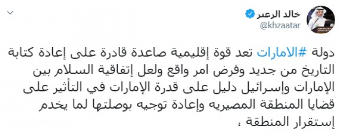 وكتب عبر تغريدة له على "تويتر" رصدها " المشهد العربي":"دولة الإمارات تعد قوة إقليمية صاعدة قادرة على إعادة كتابة التاريخ من جديد وفرض أمر واقع ولعل اتفاقية السلام بين الإمارات وإسرائيل دليل على قدرة الإمارات في التأثير على قضايا المنطقة المصيرية وإعادة توجيه بوصلتها لما يخدم استقرار المنطقة".