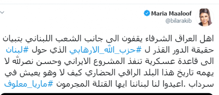وكتبت عبر تغريدة لها على "تويتر" رصدها " المشهد العربي": "أهل العراق الشرفاء يقفون إلى جانب الشعب اللبناني بتبيان حقيقة الدور القذر لحزب الله الإرهابي الذي حول لبنان إلى قاعدة عسكرية تنفذ المشروع الإيراني، وحسن نصرالله لا يهمه تاريخ هذا البلد الراقي الحضاري كيف لا وهو يعيش في سرداب، اعيدوا لنا لبناننا أيها القتلة المجرمون".
