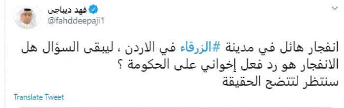 وقال في تغريدة عبر "تويتر" رصدها "المشهد العربي": "انفجار هائل في مدينة الزرقاء في الأردن، ليبقى السؤال هل الانفجار هو رد فعل إخواني على الحكومة؟ سنتظر لتتضح الحقيقة".