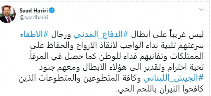 أشاد رئيس وزراء لبنان الأسبق سعد الحريري، اليوم، بدور رجال الدفاع المدني والإنقاذ في السيطرة على الحريق الذي اندلع بمرفأ بيروت.