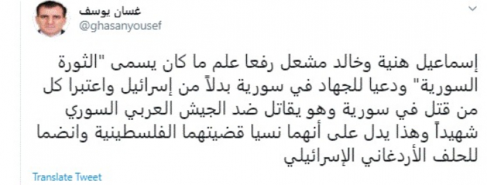 وقال في تغريدة عبر "تويتر" رصدها "المشهد العربي": "إسماعيل هنية وخالد مشعل رفعا علم ما كان يسمى "الثورة السورية" ودعيا للجهاد في سورية بدلاً من إسرائيل واعتبرا كل من قتل في سورية وهو يقاتل ضد الجيش العربي السوري شهيداً وهذا يدل على أنهما نسيا قضيتهما الفلسطينية وانضما للحلف الأردغاني الإسرائيلي".