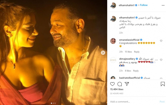 وظهر أمير في واحدة من الصور وهو يقبل رأس إلهام، التي كتبت معلقة "مبروك يا أمير يا حبيبي ربنا يسعدك، ويفرح قلبك ويفرحني بولادك يا أغلى الناس".