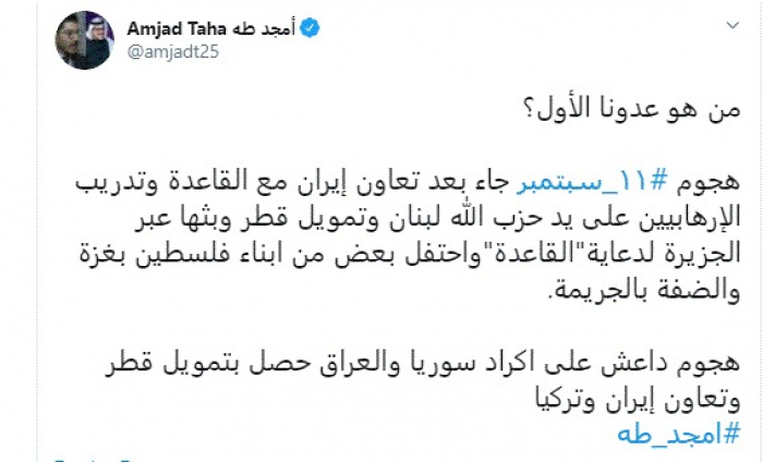 وقال في تغريدة عبر "تويتر" رصدها "المشهد العربي": "من هو عدونا الأول؟ هجوم ١١ سبتمبر جاء بعد تعاون إيران مع القاعدة وتدريب الإرهابيين على يد حزب الله لبنان وتمويل قطر وبثها عبر الجزيرة لدعاية القاعدة واحتفل بعض من ابناء فلسطين بغزة والضفة بالجريمة".