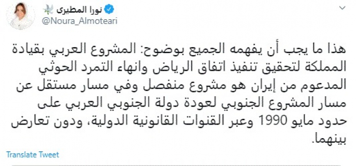 قالت الكاتبة والباحثة نورا المطيري، اليوم، إن المشروع العربي بقيادة السعودية بالانتصار على مليشيات الحوثي منفصل تمامًا عن مسار عودة دولة الجنوب العربي.