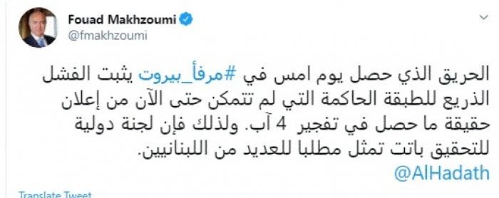 وكتب في تغريدة عبر "تويتر" رصدها "المشهد العربي": "الحريق الذي حصل يوم امس في مرفأ بيروت يثبت الفشل الذريع للطبقة الحاكمة التي لم تتمكن حتى الآن من إعلان حقيقة ما حصل في تفجير 4 آب. ولذلك فإن لجنة دولية للتحقيق باتت تمثل مطلبا للعديد من اللبنانيين".