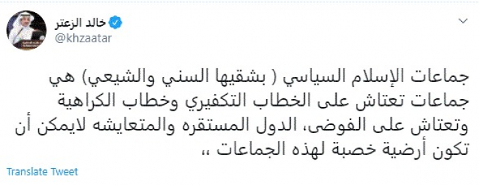 وكتب في تغريدة عبر "تويتر" رصدها "المشهد العربي": "جماعات الإسلام السياسي (بشقيها السني والشيعي) هي جماعات تعتاش على الخطاب التكفيري وخطاب الكراهية وتعتاش على الفوضى، الدول المستقرة والمتعايشة لا يمكن أن تكون أرضية خصبة لهذه الجماعات".