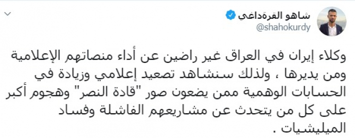 وكتب عبر تغريدة له على "تويتر" رصدها " المشهد العربي": "وكلاء إيران في العراق غير راضين عن أداء منصاتهم الإعلامية ومن يديرها ، ولذلك سنشاهد تصعيد إعلامي وزيادة في الحسابات الوهمية ممن يضعون صور "قادة النصر" وهجوم أكبر على كل من يتحدث عن مشاريعهم الفاشلة وفساد المليشيات".