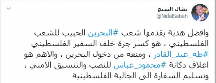 وكتب عبر تغريدة له على " تويتر" رصدها " المشهد العربي" :" وأفضل هدية يقدمها شعب البحرين الحبيب للشعب الفلسطيني، هو كسر جرة خلف السفير الفلسطيني طه عبد القادر، ومنعه من دخول البحرين، والأهم هو إغلاق دكانة محمود عباس للنصب والتنسيق الأمني، وتسليم السفارة إلى الجالية الفلسطينية".