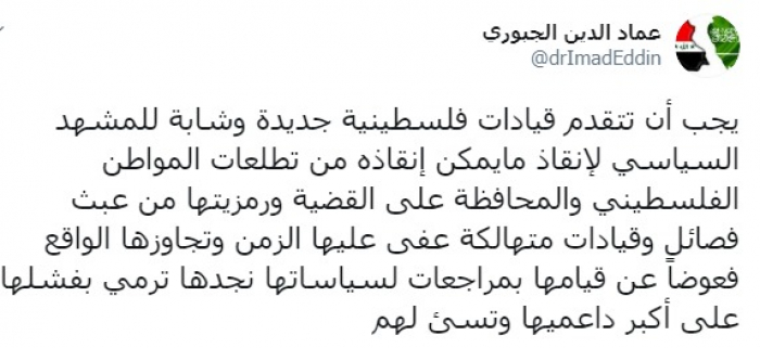 وكتب عبر تغريدة له على "تويتر" رصدها " المشهد العربي": "يجب أن تتقدم قيادات فلسطينية جديدة وشابة للمشهد السياسي لإنقاذ ما يمكن إنقاذه من تطلعات المواطن الفلسطيني والمحافظة على القضية ورمزيتها من عبث فصائل وقيادات متهالكة عفى عليها الزمن وتجاوزها الواقع فعوضاً عن قيامها بمراجعات لسياساتها نجدها ترمي بفشلها على أكبر داعميها وتسئ لهم".