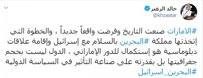 وكتب عبر تغريدة له على "تويتر" رصدها " المشهد العربي": "الإمارات صنعت التاريخ وفرضت واقعاً جديداً ، والخطوة التي اتخذتها مملكة البحرين بالسلام مع إسرائيل وإقامة علاقات دبلوماسية هو استكمال للدور الإماراتي، الدول ليست بحجم جغرافيتها بل بقدرته على صناعة التأثير في السياسة الدولية".