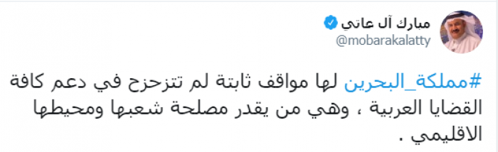 وكتب عبر تغريدة له على "تويتر" رصدها " المشهد العربي": "مملكة البحرين لها مواقف ثابتة لم تتزحزح في دعم كافة القضايا العربية، وهي من يقدر مصلحة شعبها ومحيطها الاقليمي".