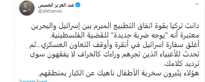 وجه الإعلامي السعودي عبدالعزيز الخميس، اليوم، رسالة نارية للنظام التركي بعد موقفه من معاهدة السلام بين إسرائيل والبحرين.