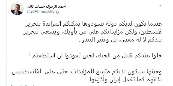 وقال في تغريدة عبر "تويتر" رصدها "المشهد العربي": "عندما تكون لديكم دولة تسودوها يمكنكم المزايدة بتحرير فلسطين، ولكن مزايداتكم على من يأويك، ويسعى لتحرير بلدكم لا له معنى، بل ويثير التندر".