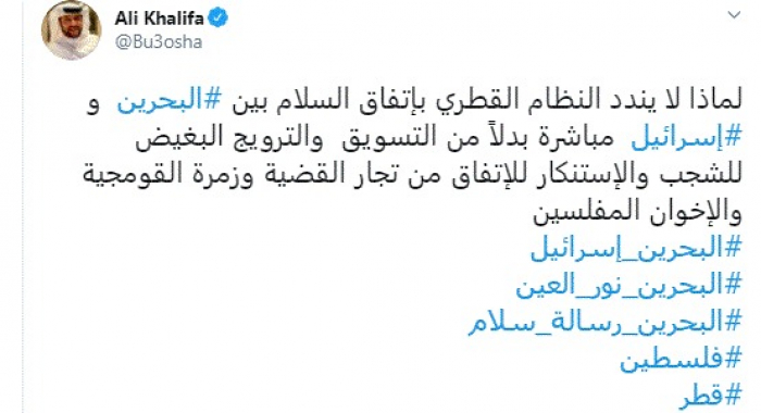 وقال في تغريدة عبر "تويتر" رصدها "المشهد العربي": "لماذا لا يندد النظام القطري باتفاق السلام بين البحرين وإسرائيل مباشرة بدلاً من التسويق والترويج البغيض للشجب والاستنكار للاتفاق من تجار القضية وزمرة القومجية والإخوان المفلسين".