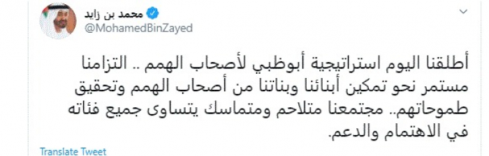 وقال في تغريدة عبر "تويتر" رصدها "المشهد العربي": "أطلقنا اليوم استراتيجية أبوظبي لأصحاب الهمم .. التزامنا مستمر نحو تمكين أبنائنا وبناتنا من أصحاب الهمم وتحقيق طموحاتهم.. مجتمعنا متلاحم ومتماسك يتساوى جميع فئاته في الاهتمام والدعم".