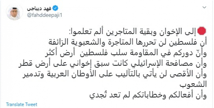 وجه المحلل السياسي السعودي فهد ديباجي، اليوم، رسالة نارية لجماعة الإخوان والمتاجرين بالقضية الفلسطينية.